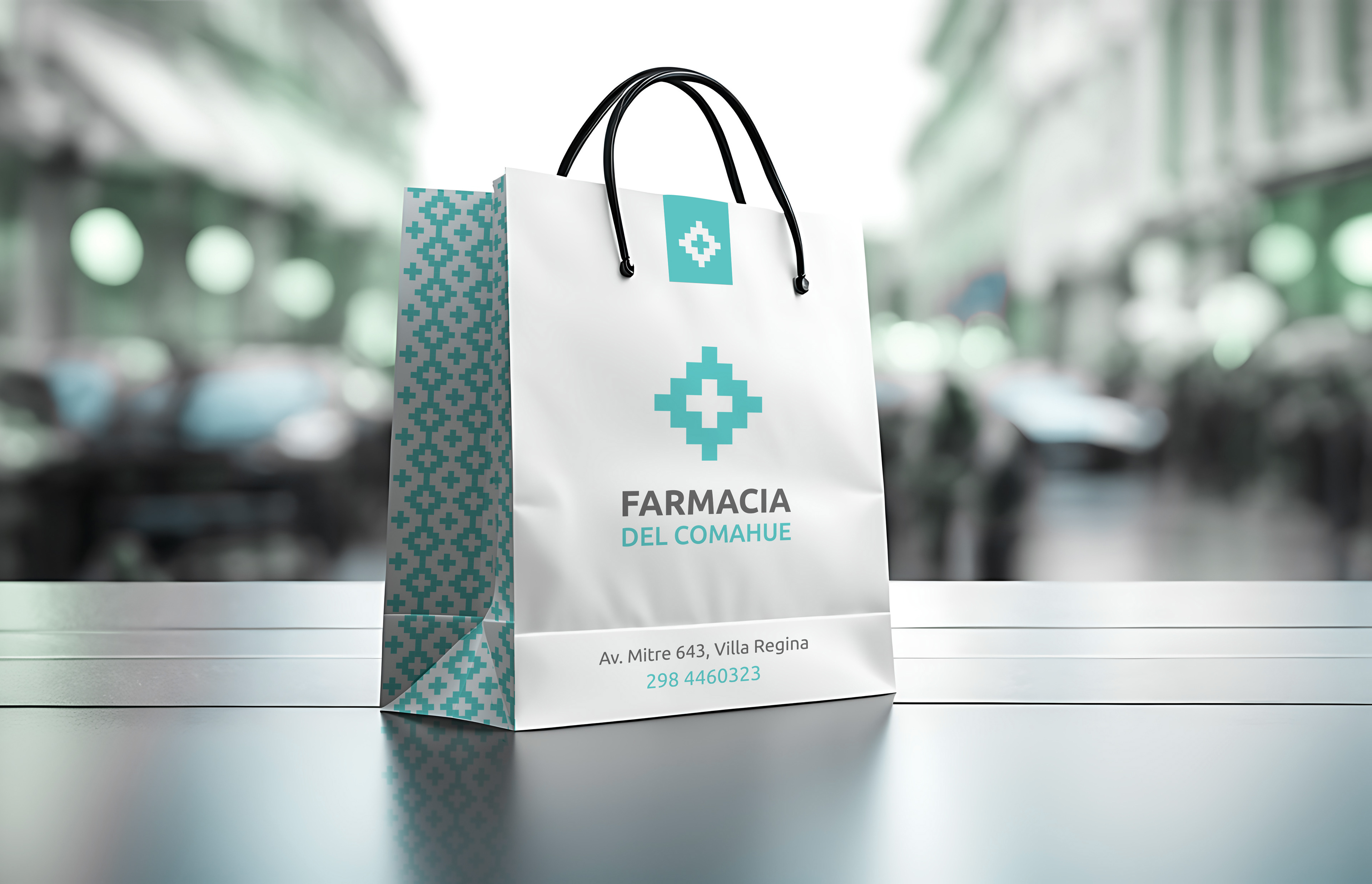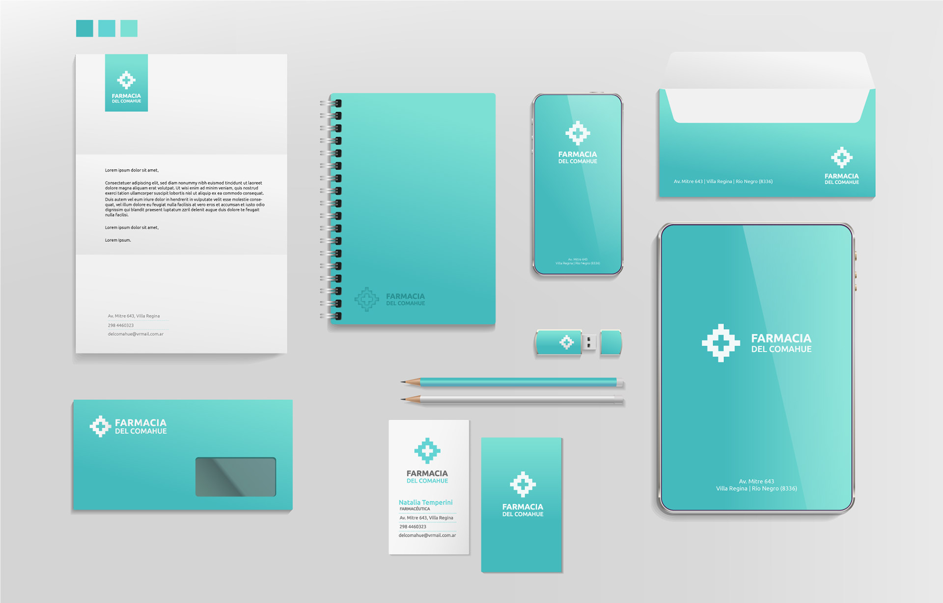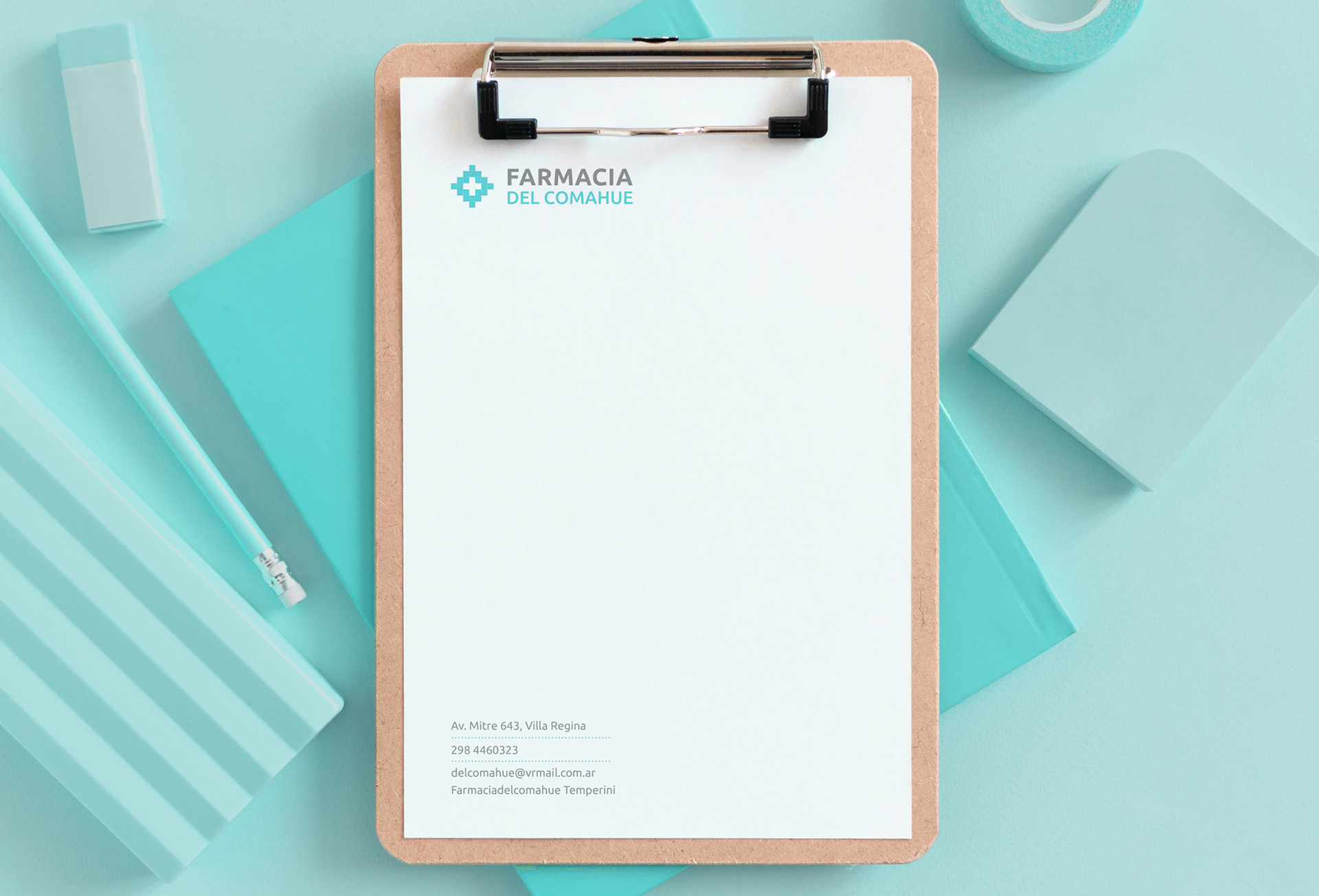 Visual identity system design for a pharmacy store. Logo, stationery, storefront sign, packaging.